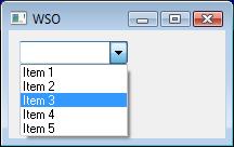 o = new ActiveXObject("Scripting.WindowSystemObject") o.EnableVisualStyles = true f = o.CreateForm(0,0,0,0) f.Text = "WSO" f.ClientWidth = 200 f.ClientHeight = 100 f.CenterControl() ComboBox = f.CreateComboBox(10,10,100,25) with (ComboBox) { Add("Item 1") Add("Item 2") Add("Item 3") Add("Item 4") Add("Item 5") } f.Show() o.Run()